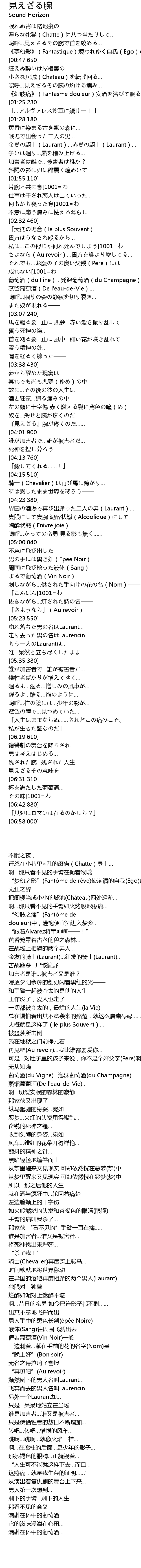 | [01:15.770] | 《幻肢痛》(Fantasme douleur)安酒を浴ぴて眠る… |