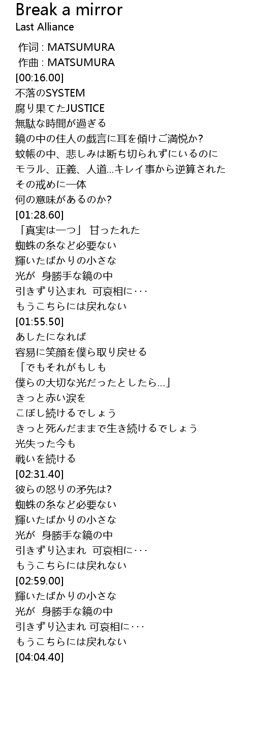 | [01:05.85] | 鏡の中の住人の戯言に耳を傾けご満悦か? |