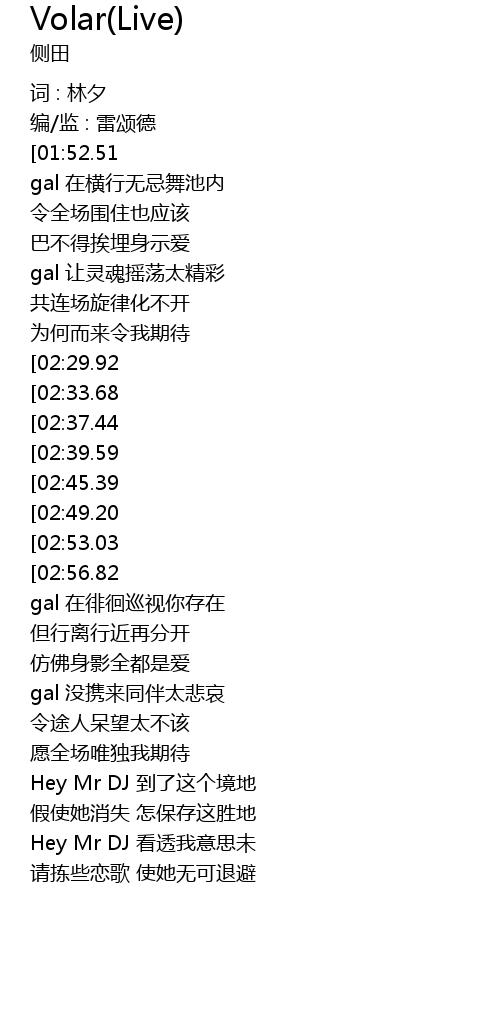 | [01:35.66][02:45.39][03:31.70] | Hey Mr DJ 要播爆这天地 |