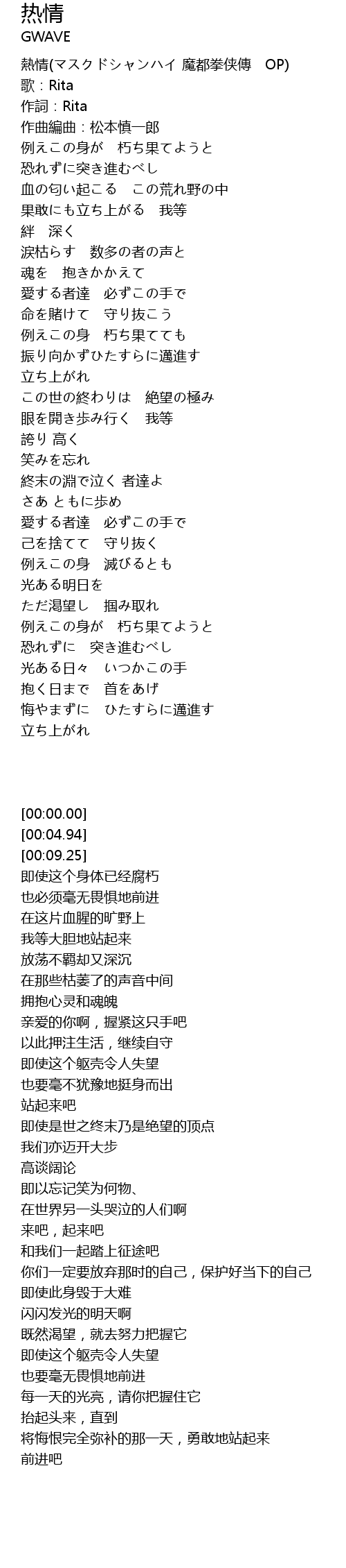 | [00:00.00] | 熱情(マスクドシャンハイ 魔都拳侠傳 OP) |
