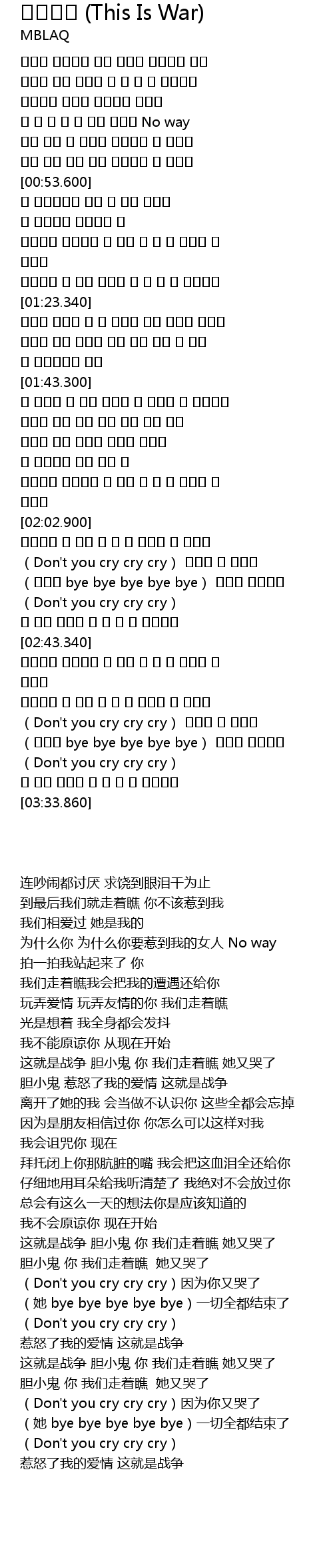 | [02:54.0] | 전쟁이야 겁쟁이야 너 두고 봐 봐 너 그녀가 또 울잖아 |