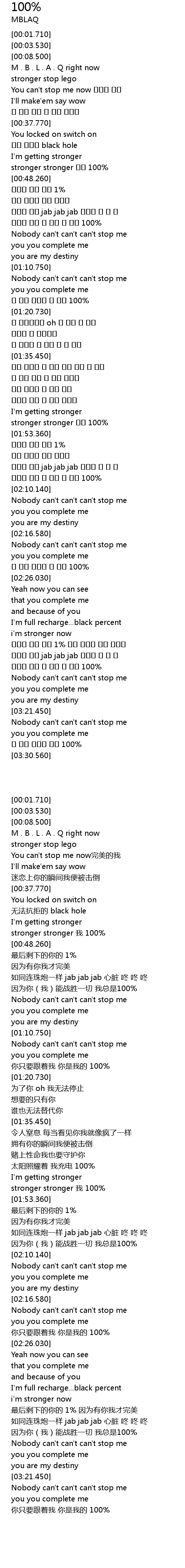| [03:10.700] | 因为你(我)能战胜一切 我总是100% |