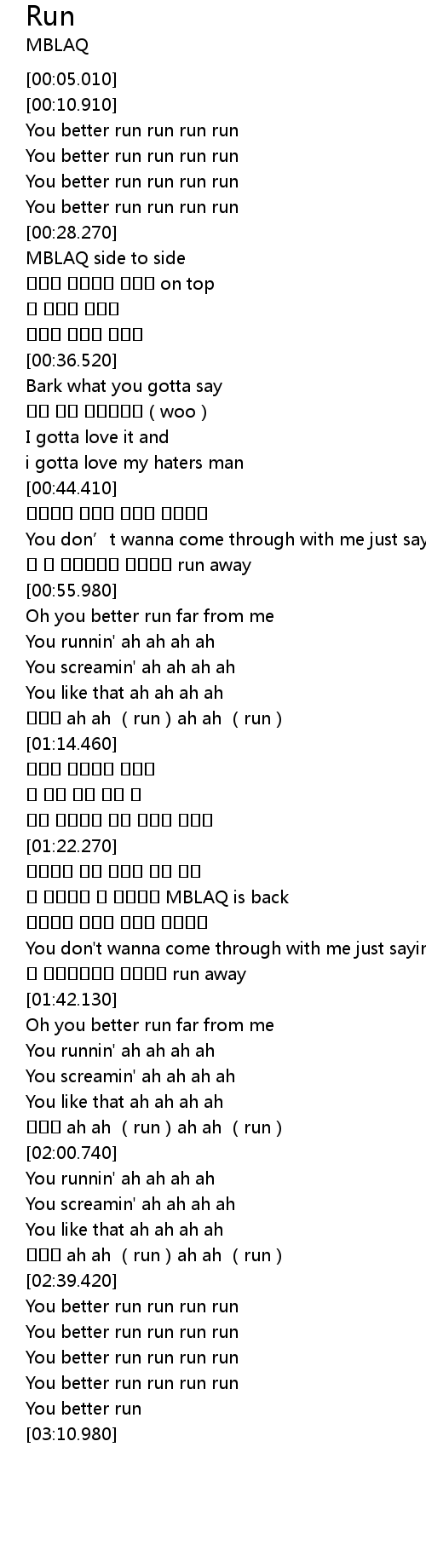| [01:26.550] | 날 피하려면 더 빨리뛰어 MBLAQ is back |
