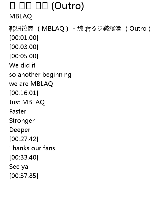 | [00:00.00] | 鞐犽笖霝 (MBLAQ) - 霕 雼るジ鞁滌瀾 (Outro) |