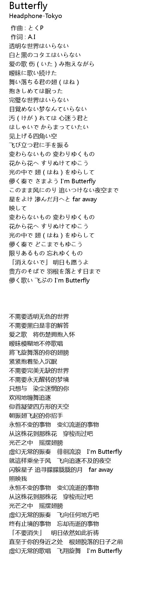 | [02:05.92] | 虛幻无常的振奏 徘徊流浪 I'm Butterfly |