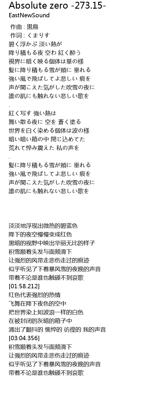 | [01:45.884] | 声が聞こえた気がした吹雪の夜に |