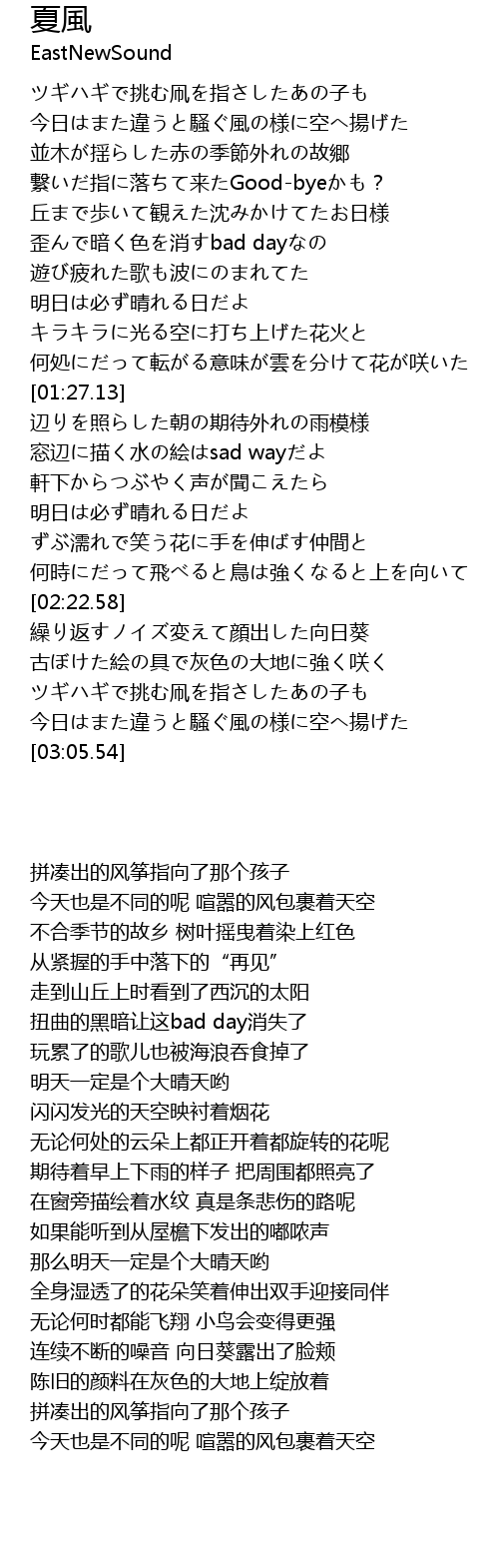 | [02:55.78] | 今日はまた違うと騒ぐ風の様に空へ揚げた |