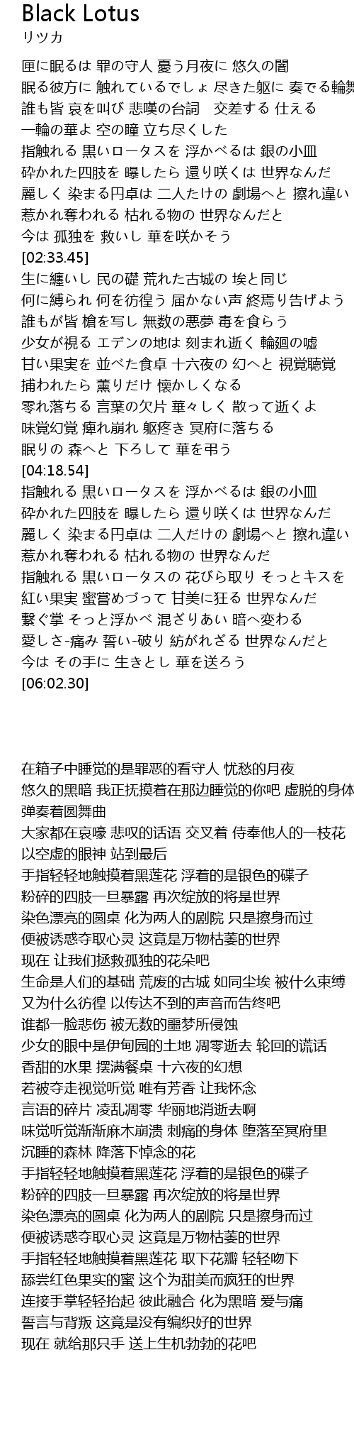 | [04:57.28] | 指触れる 黒いロータスを 浮かべるは 銀の小皿 砕かれた四肢を 曝したら 還り咲くは 世界なんだ |