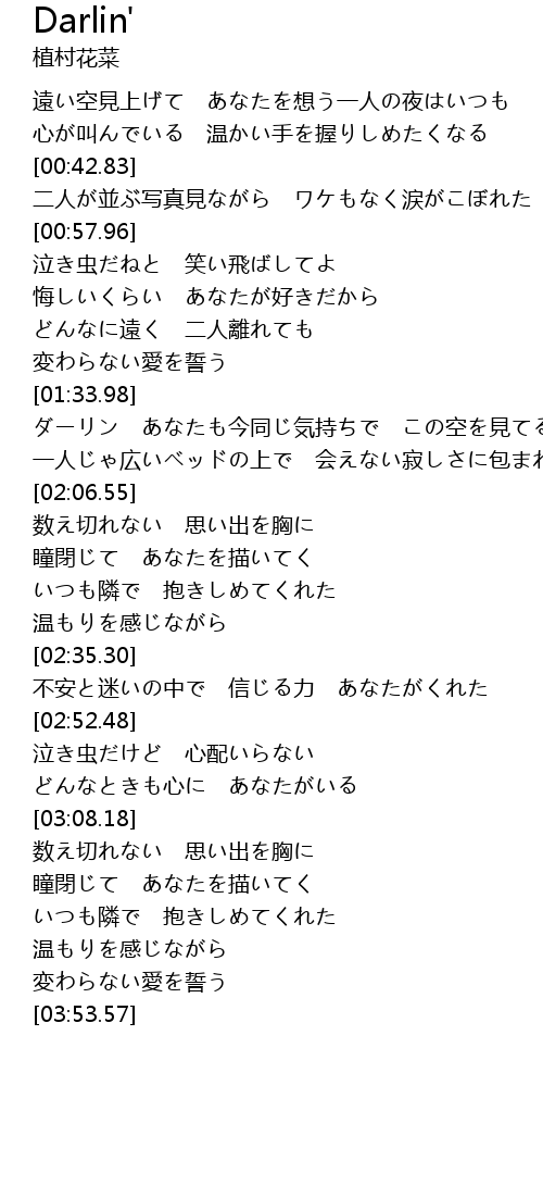 | [01:38.02] | ダーリン あなたも今同じ気持ちで この空を見てるの? |