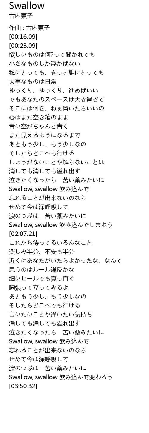 | [03:22.66] | Swallow, swallow 飲み込んで |