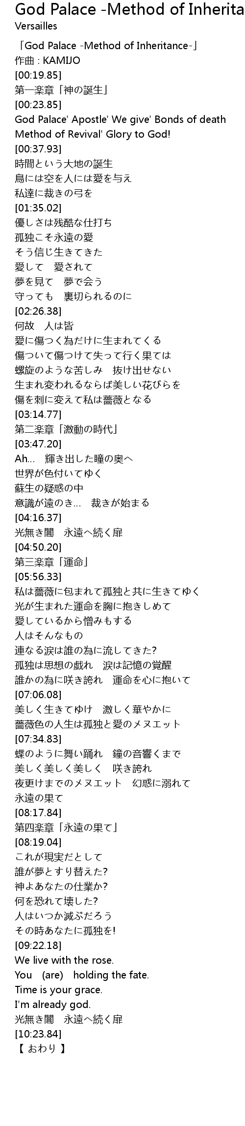 | [00:01.85] | 「God Palace -Method of Inheritance-」 |