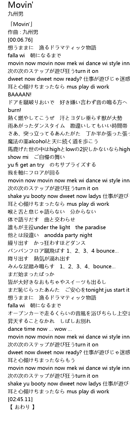 | [00:16.15] | movin now movin now mek wi dance wi style inna di dance |