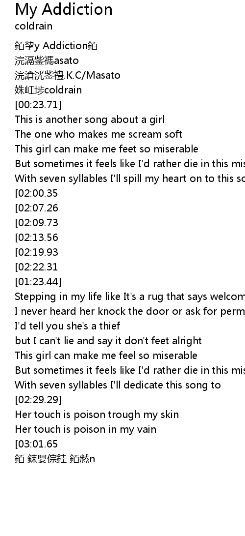 | [03:31.80][02:22.31][01:19.12] | It' s my my my my my addiction |