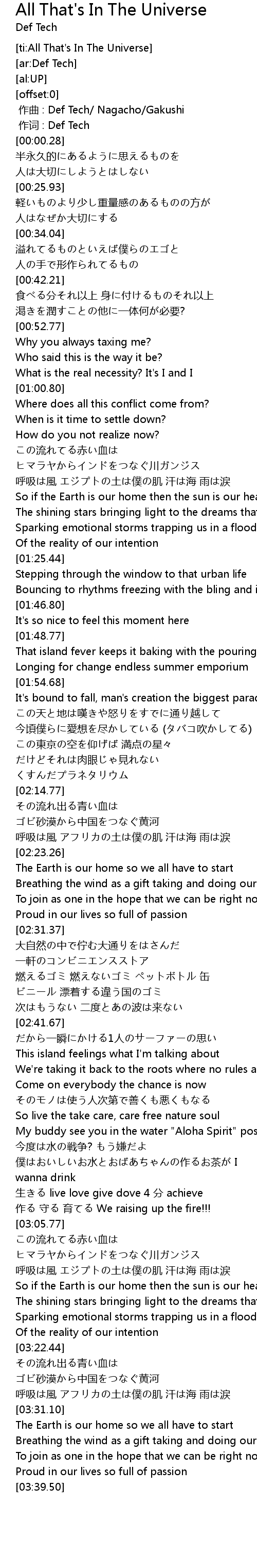 | [03:27.51] | 呼吸は風 アフリカの土は僕の肌 汗は海 雨は涙 |