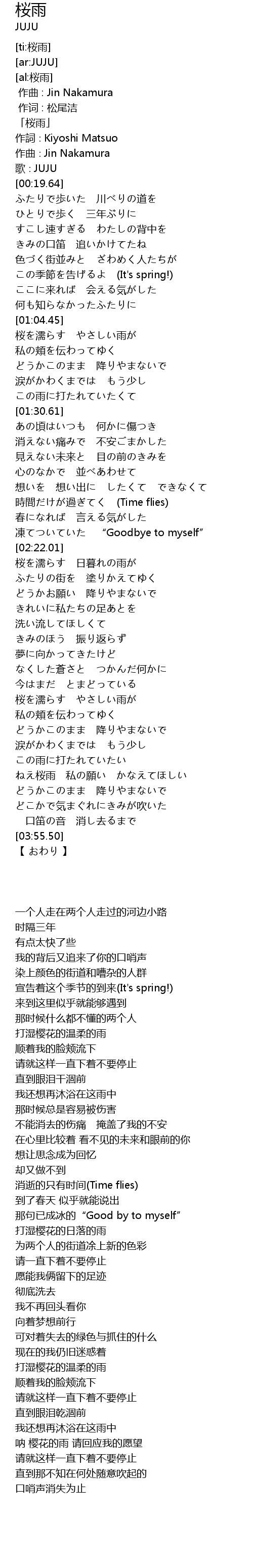 | [03:32.39] | 呐 樱花的雨 请回应我的愿望 |