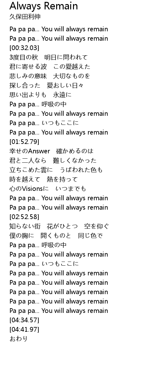 | [03:54.35] | Pa pa pa... You will always remain |