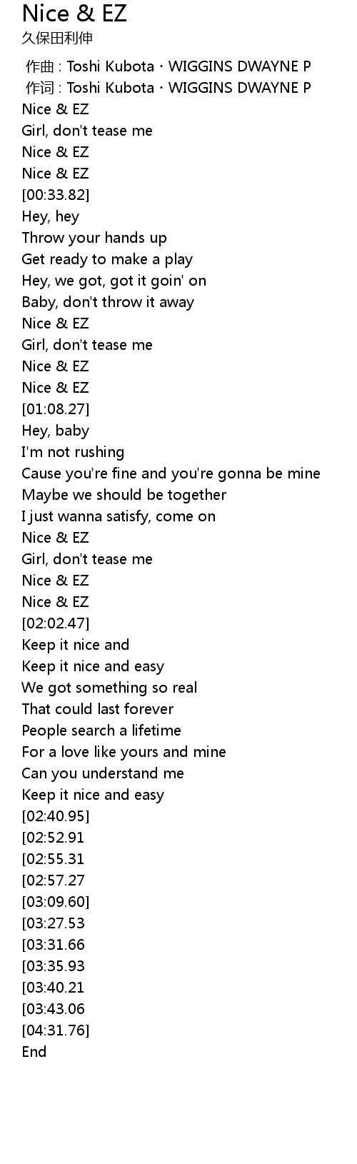 | [00:01.00] | 作词 : Toshi Kubota・WIGGINS DWAYNE P |