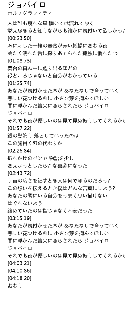 | [01:41.14] | 闇に浮かんだ篝火に照らされたら ジョバイロ ジョバイロ |
