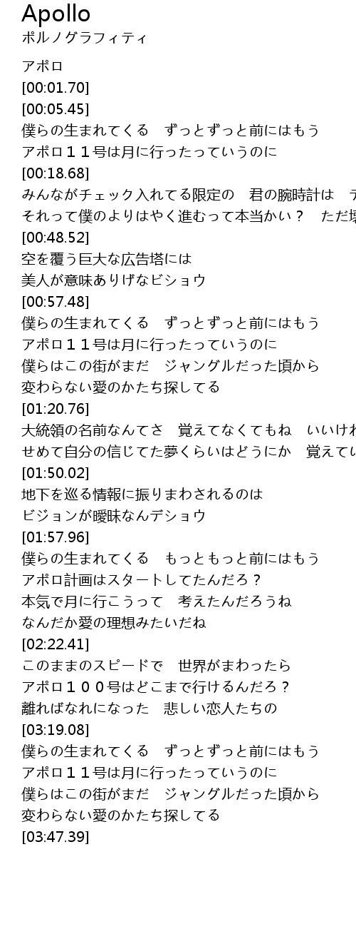 | [03:08.98] | アポロ100号はどこまで行けるんだろ? |
