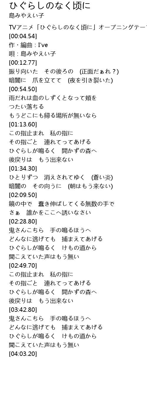 | [00:03.00] | TVアニメ「ひぐらしのなく頃に」オープニングテーマ |