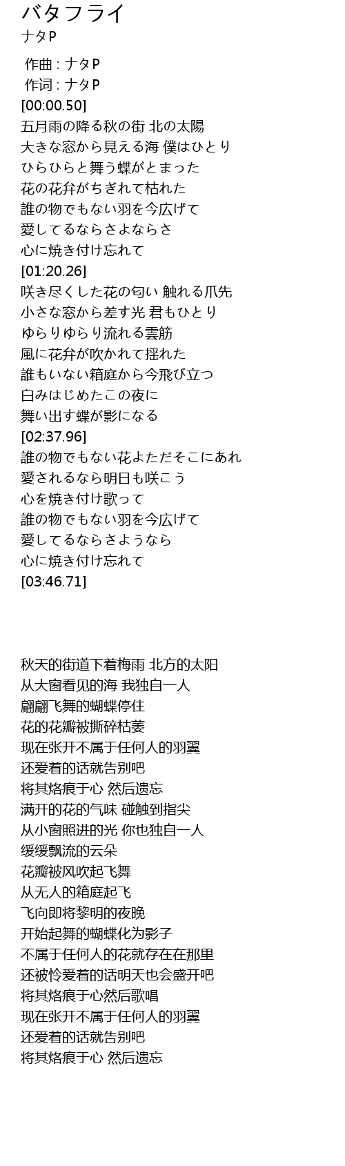 | [00:41.84] | ひらひらと舞う蝶がとまった |