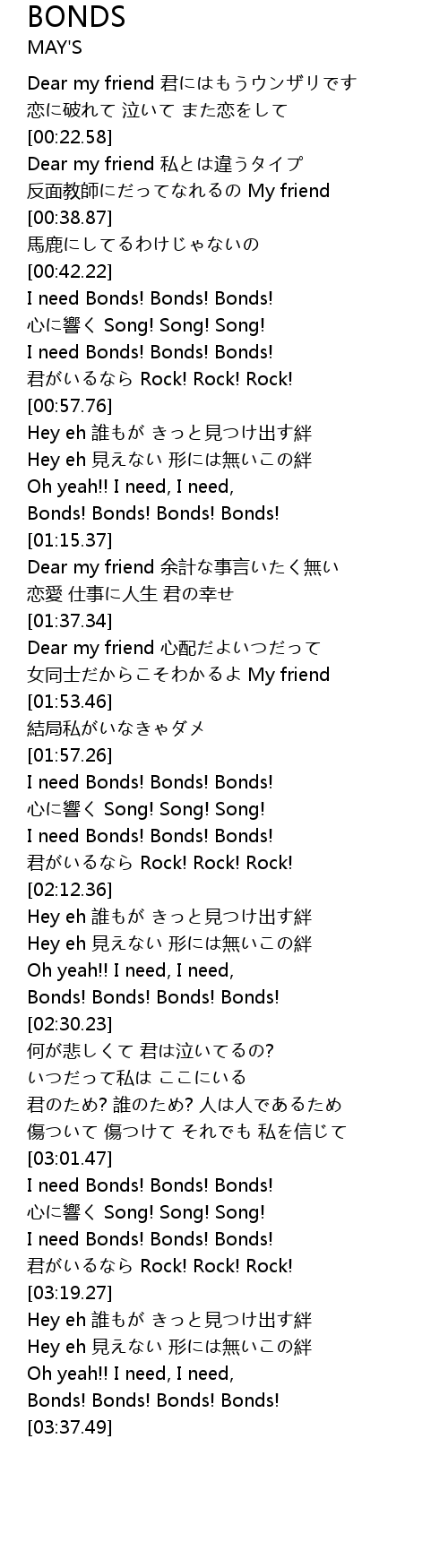 | [00:43.19] | I need Bonds! Bonds! Bonds! |