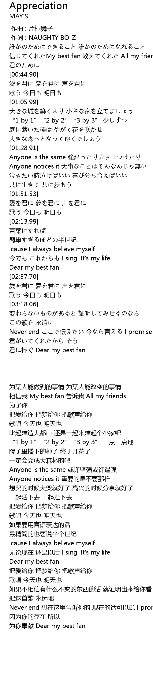 | [00:33.83] | 信じてくれたMy best fan 教えてくれた All my friends |