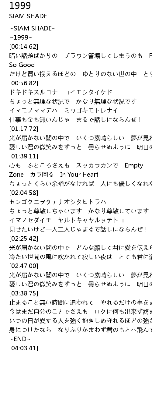 | [01:44.19] | 心も ふところさえも スッカラカンで Empty Zone カラ回る In Your Heart |