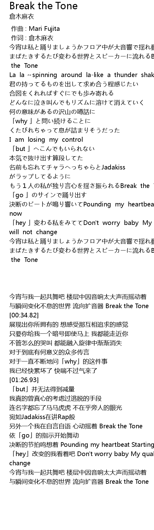 | [02:34.08] | まばたきするたび変わる世界とスピーカーに流れるBreak the Tone |