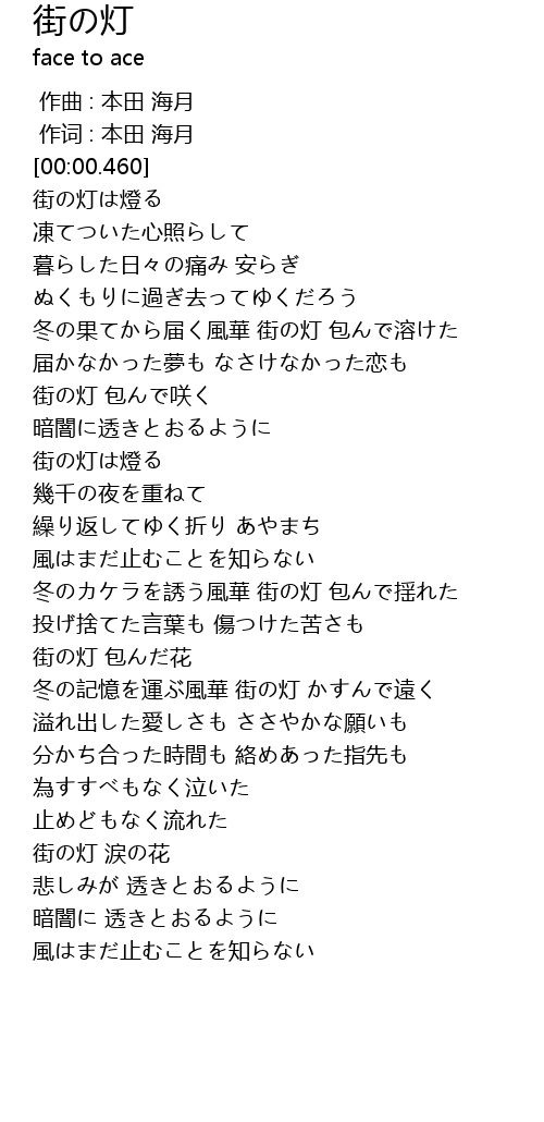 | [03:08.450] | 冬の記憶を運ぶ風華 街の灯 かすんで遠く |
