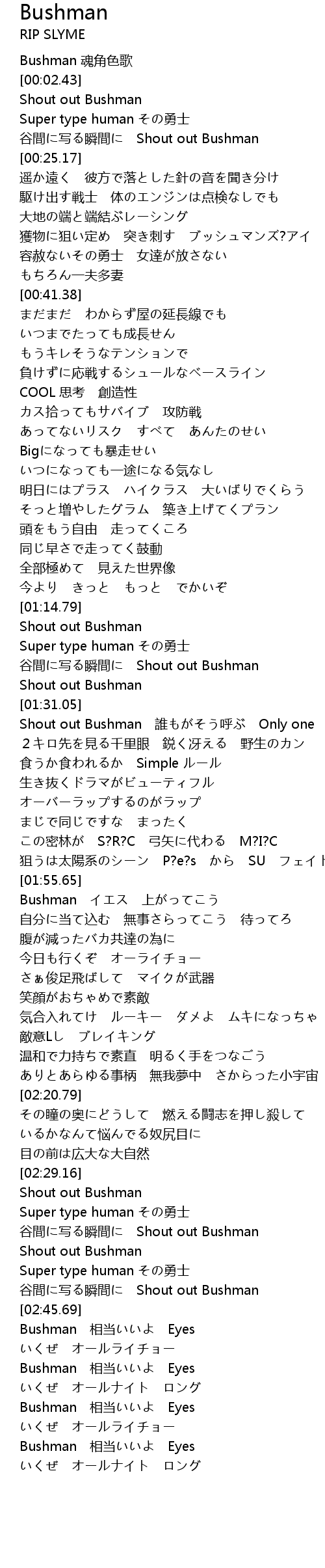 [01:32.05] Shout out Bushman 誰もがそう呼ぶ Only one