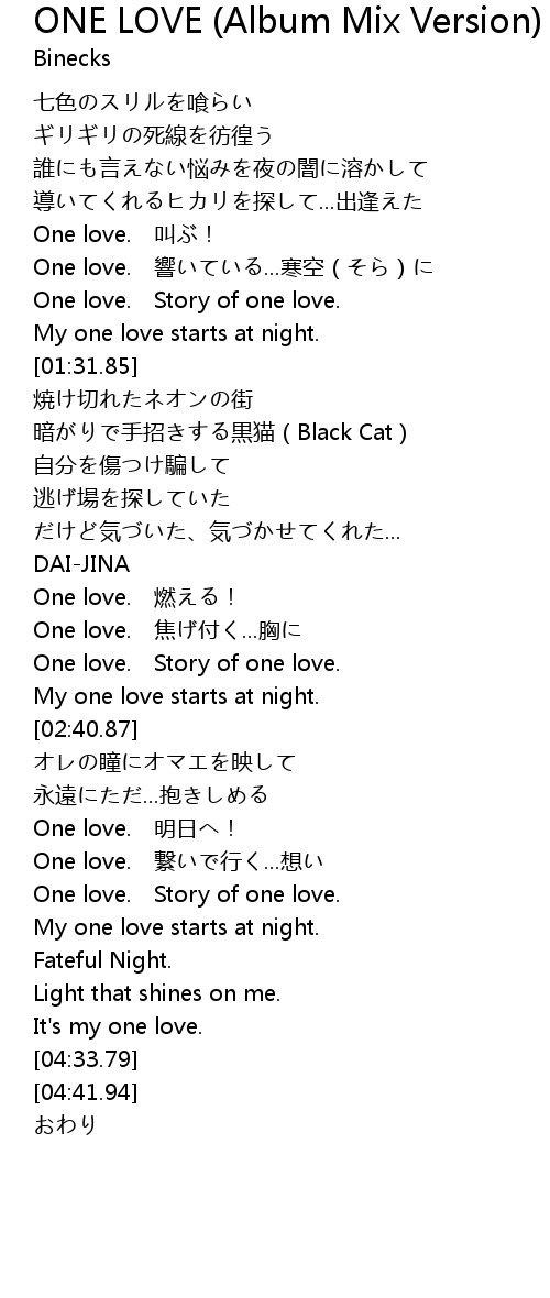 | [02:21.58] | One love. 焦げ付く...胸に |
