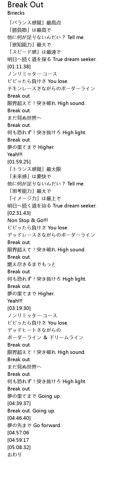 | [04:14.35] | 限界超えて!突き破れ High sound. |
