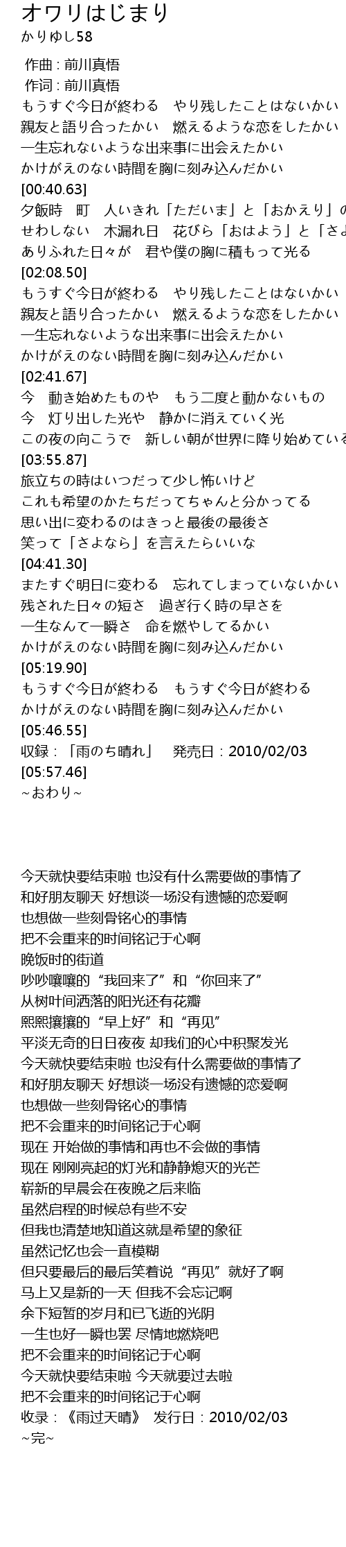 | [05:21.43] | もうすぐ今日が終わる もうすぐ今日が終わる |