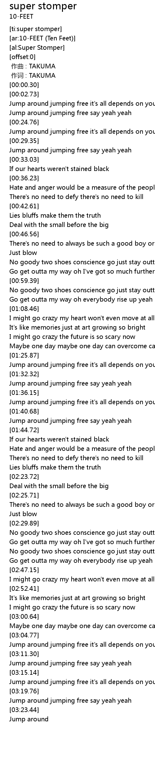 | [03:08.02] | Jump around jumping free it's all depends on you |