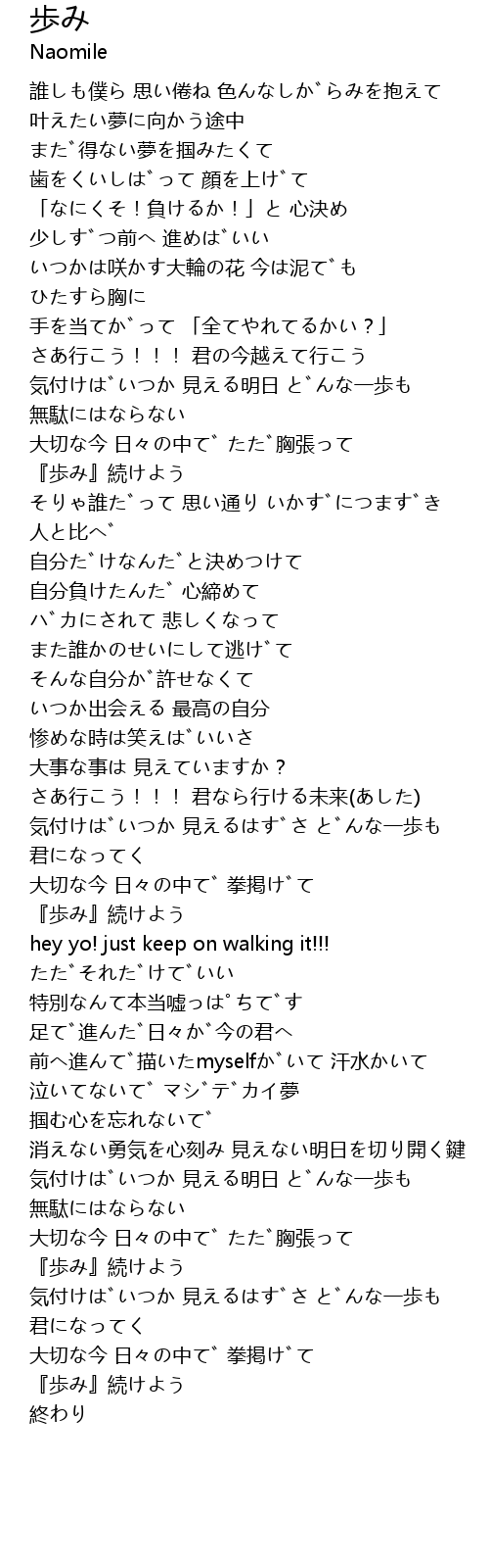 | [05:04.166] | 大切な今 日々の中で 拳掲げて 『歩み』続けよう |