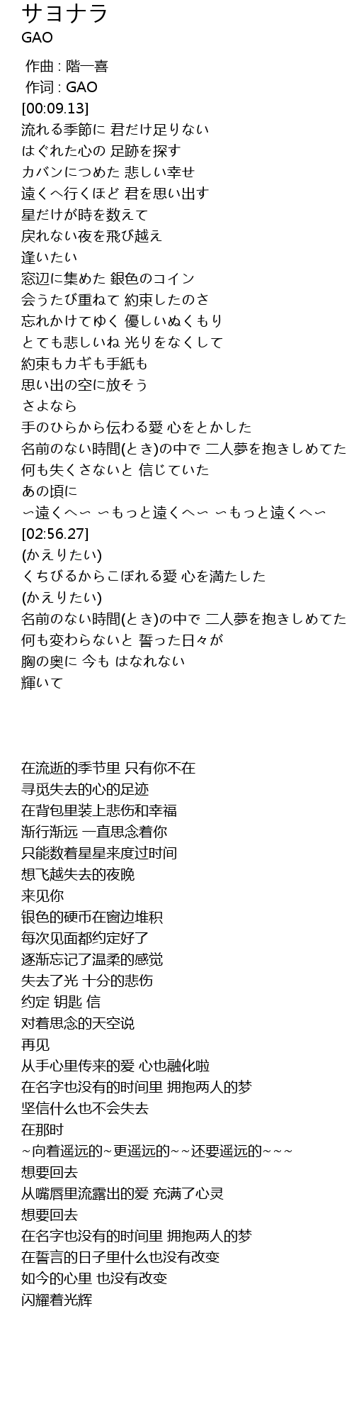 | [00:17.51] | 流れる季節に 君だけ足りない |