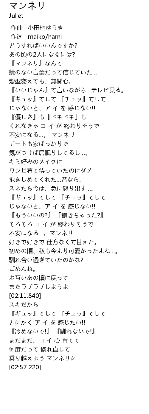 | [02:49.380] | 乗り越えよう マンネリ☆ |