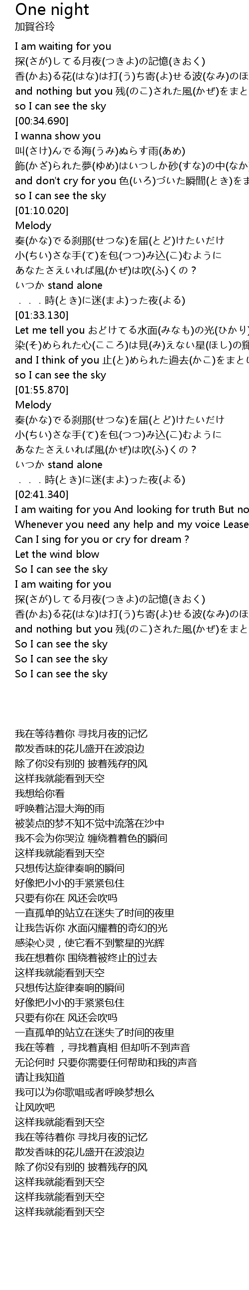 | [00:12.600] | I am waiting for you 探(さが)してる月夜(つきよ)の記憶(きおく) |