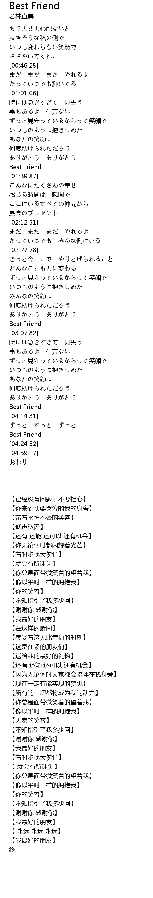 | [02:18.38] | 【因为无论何时大家都会陪伴在我身旁】 |