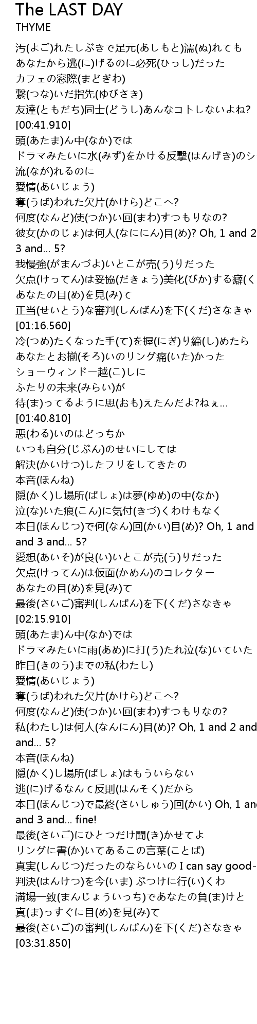 | [02:08.770] | あなたの目(め)を見(み)て 最後(さいご)審判(しんばん)を下(くだ)さなきゃ |