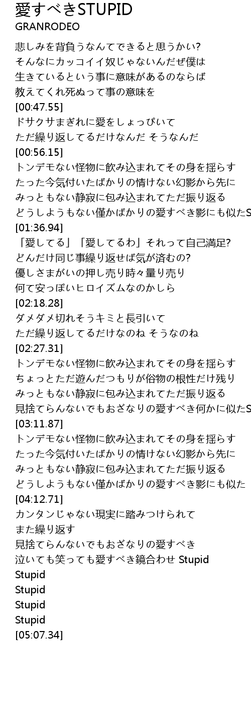 | [02:56.49] | 見捨てらんないでもおざなりの愛すべき何かに似たStupid |