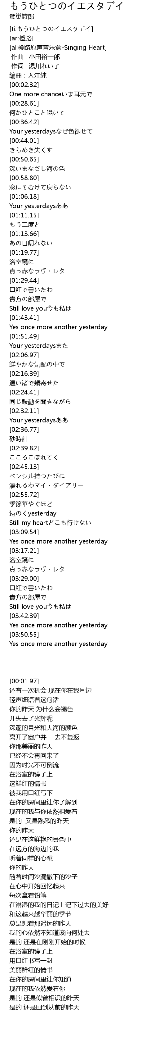 | [00:38.23] | Your yesterdaysなぜ色褪せて |