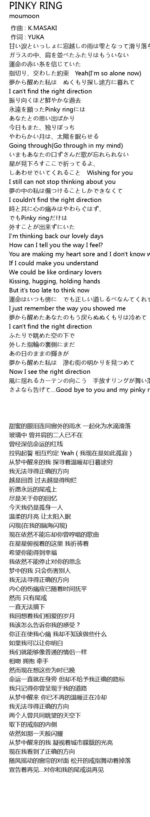 | [01:18.53] | yǒng yuǎn yuàn Pinky ring |