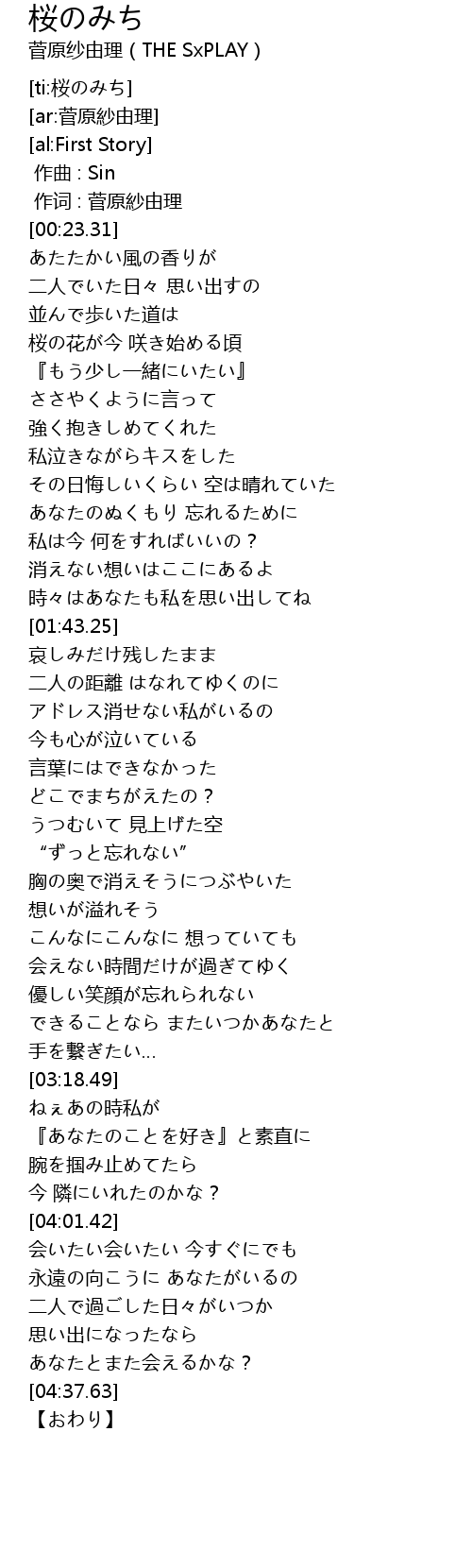 | [00:01.00] | 作词 : 菅原紗由理 |