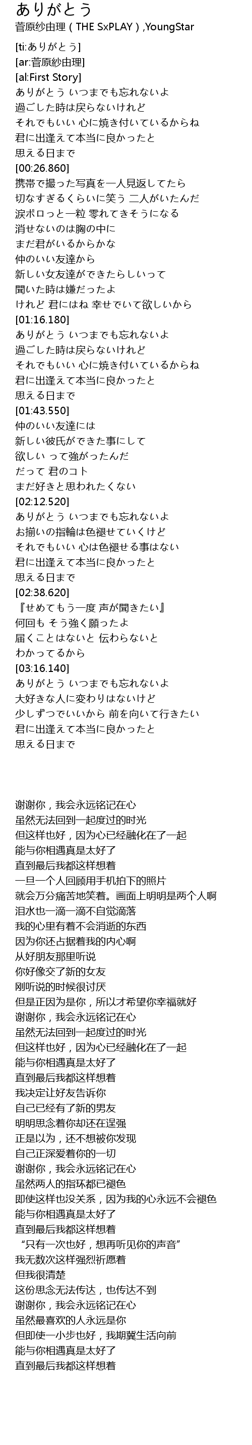 | [00:02.060] | ありがとう いつまでも忘れないよ |