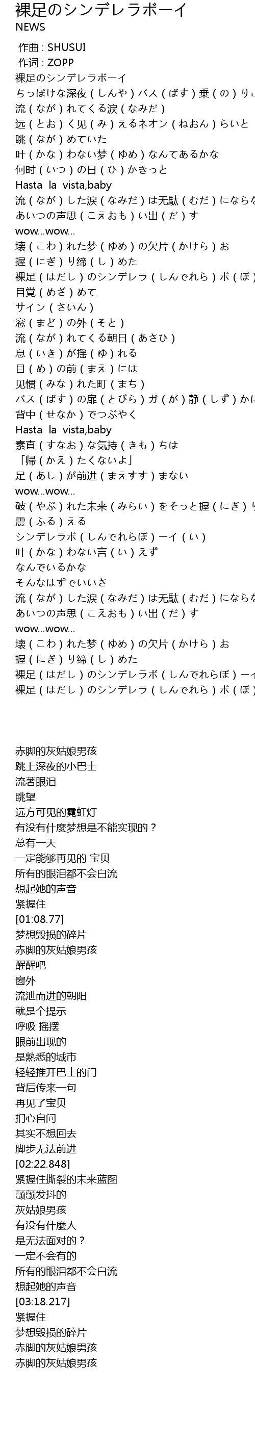 | [01:16.143] | 裸足(はだし)のシンデレラ(しんでれら)ボ(ぼ)ーイ(い) |