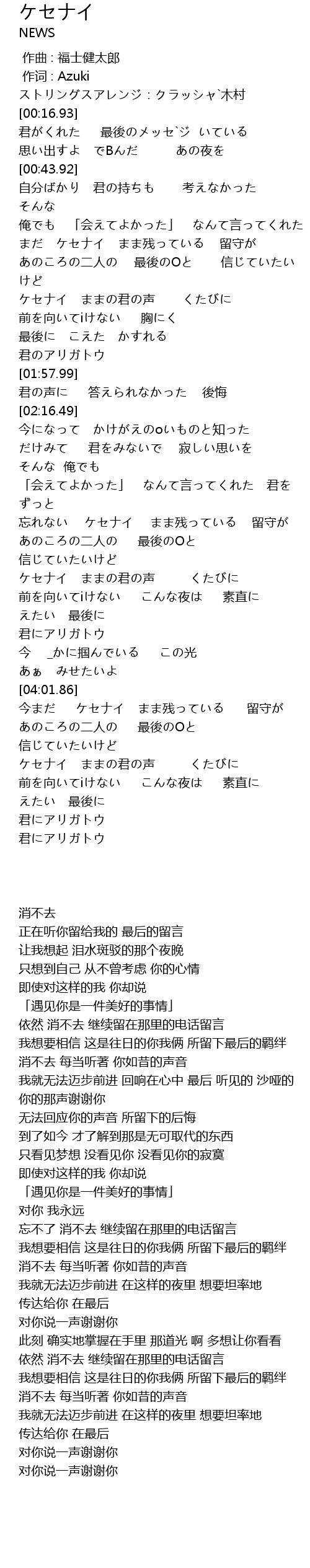 | [04:16.82] | 今まだ ケセナイ まま残っている 留守が |
