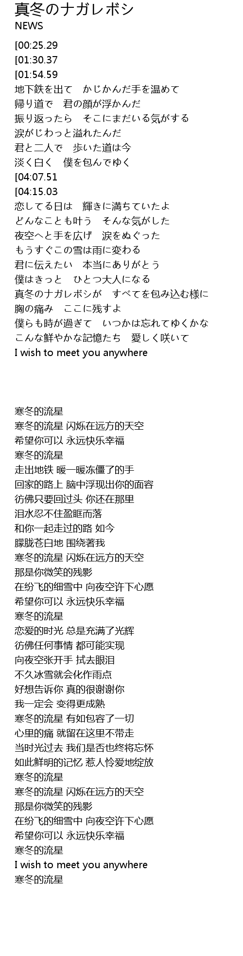 | [00:01.00][00:25.29][02:06.51][03:39.88][04:35.26][04:56.31] | NEWS-真冬のナガレボシ |