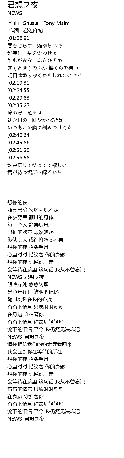 | [00:08.00][01:06.91][01:56.89][03:03.67] | NEWS-君想フ夜 |